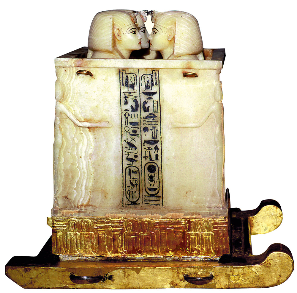 這座存放內臟儲藏罐的外棺,形如四柱撐頂的小亭,頂部裝飾有眼鏡蛇雕刻。四面各站立著一位展臂守護的女神,她們的袍子自然地勾勒出身體曲線,展現了阿肯那頓時期獨特的藝術風格。外棺上還刻有深刻的銘文,旨在守護法老,直到他重生為止。