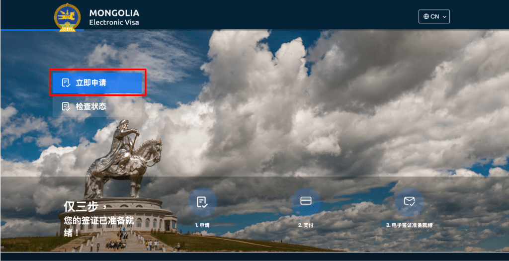 首先到進入蒙古移民署官方網站(https://evisa.mn),想要轉中文的話,右上角有一個語言選擇,裡面選擇「CN」後就會是中文的介面,然後點擊「立即申請」。