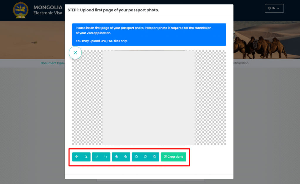 上傳證件照的部分,和前面護照一樣只可以上傳 JPG 或 PNG 檔案,上傳後需要先拖到左側做裁切或是旋轉方向等的調整,確定好後就可以點「Crop done」完成上傳。