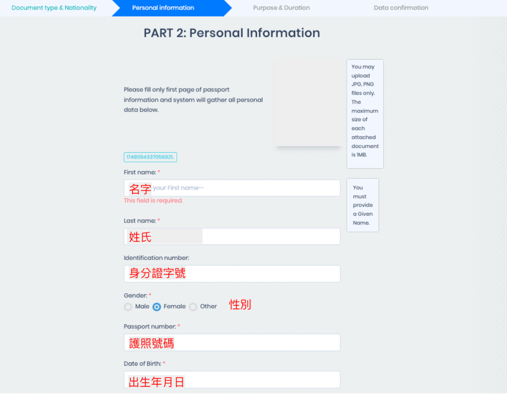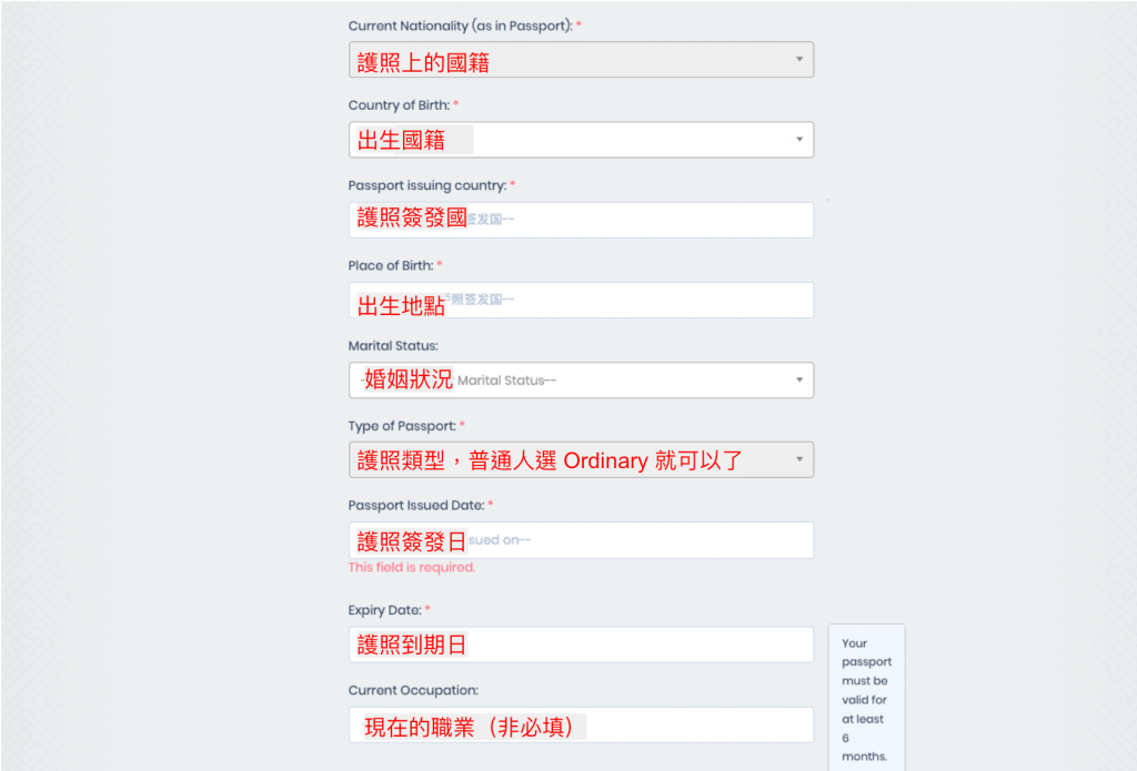 之後就要開始填寫個人資料,如果你上傳的護照是清晰的,基本上這裡的資料欄位就會自動帶入你的資料,但是還是必須確認好每一項資料,因為還是有可能會有錯喔。