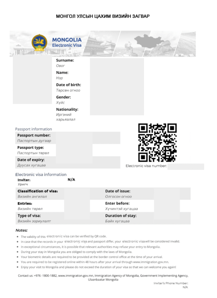 處理時間約為 3~5 個工作天,完成後可取得停留 30 天的簽證,並且可向蒙古移民署申請延長一次,最長可停留至 60 天。此外,紙本簽證可依需求申請單次或兩次入境。若旅程包含蒙古鄰國如俄羅斯,也可考慮申辦蒙古的過境簽證(Transit Visa),其停留期最多為10天。
